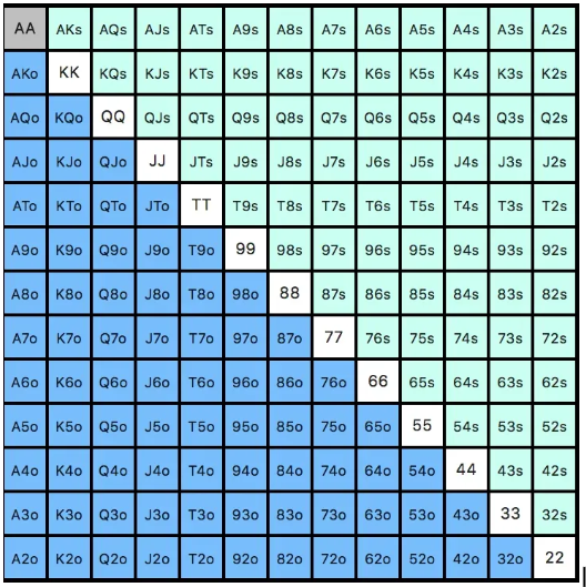 Den mest effektive måde at forstå poker ranges på er ved at visualisere dem i et hand grid (et hånddiagram). Dette grid viser alle mulige hænder, du kan få i No-Limit Hold’em.